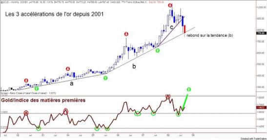 Il est clair ici que la bougie rouge représentant le mois de septembre est juste venue rebondir, avec un effet de ressort appréciable, sur la tendance de fonds (b). Désormais, la hausse de l'or devient très probable. Et l'amplitude du mouvement peut le mener à 1280 USD avant 2009.