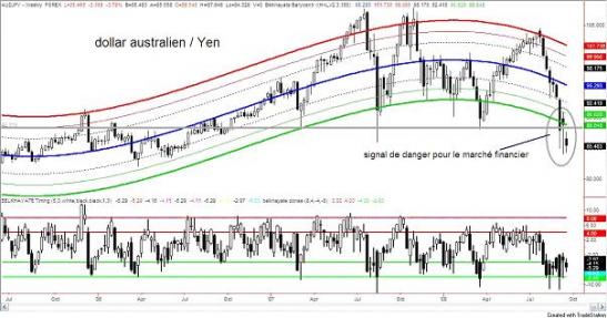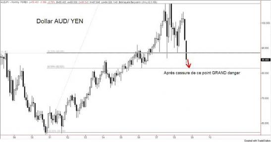 La paire de devises AUDJPY avait un très fort support : 1 dollar australien pour 88 yens. Il porte le nom de ligne de cou, pour les connaisseurs. Ce plancher a craqué et l'on assiste à un enfoncement sérieux, puisque cette semaine on reste en dessous. Cela signifie que le yen change de tendance. Que ceux qui l'ont emprunté à bon prix vont devoir courir pour le rembourser avant qu'il ne devienne hors de prix. Que l'ère du fameux « carry trade » sur le yen sonne le terminus. Comme je l'avais annoncé l'année dernière, les millions de milliards de yen empruntés à taux zéro vont provoquer un tsunami financier dans toute la planète.