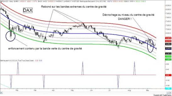 Comme annoncé la semaine dernière, le décrochage au niveau du centre de gravité a bien provoqué un gap baissier non négligeable sur le DAX. Et le CAC a suivi. Les lignes vertes nous donnent à l'avance les prochains objectifs et ils sont bien bas 5700 puis 5500. La probabilité d'arriver avant fin septembre à ces niveaux est suffisamment importante pour ne pas prendre de risque, quitte à encaisser les pertes tout de suite.