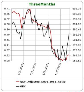 >> Le RATIO NOVA/URSA : Pour la première fois depuis début mai on voit remonter la courbe du Nova/Ursa. Cela fait exactement deux mois ou +/- 40 journées de trading. La tendance baissière n'as pas encore été cassée mais la courbe semble avoir formé un fonds duquel le ratio pourrait remonter avec beaucoup de souffle.