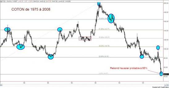 Lorsqu'on trace les proportions du nombre d'or (les séries de Fibonacci) le long de l'impulsion haussière de 1985 à 1996 on constate que ces lignes horizontales constituent des niveaux très puissants de supports et résistances de ce marché. Comme si tous les opérateurs du coton sont d'accord sur les niveaux de prix au même moment, au même endroit. Ce calcul technique nous apprend que justement en ce mois d'octobre nous sommes exactement au niveau ZERO de tout le mouvement du coton depuis 1975. Ce qui signifie que désormais la probabilité pour que le prix du coton recommence à monter est d'au moins 95% !
