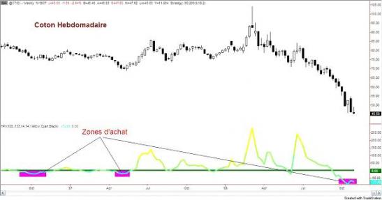 L'indicateur HPI met en équation le prix du coton, le volume ainsi que les positions ouvertes sur le marché à terme. Et à chaque fois que cet indicateur est au dessous de zéro et qu'il change de couleur, passant de vert à bleu, il y a eu un signal d'achat qui a été effectivement validé sur le marché spot. Par conséquent la fiabilité de ce signal est excellente.