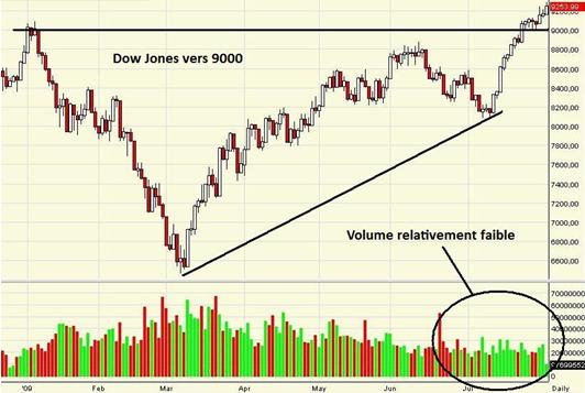 (BFM Bourse) - Les Marchés Boursiers ont fini le mois de Juillet sur un fort rallye, le Dow Jones était en hausse de 8,6% finissant au-dessus de la barre des 9000 – à 9171,61 points.