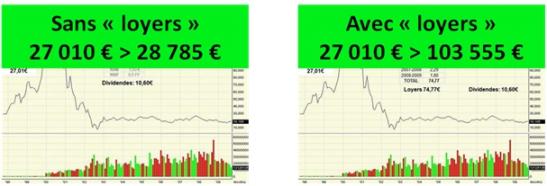 Les deux graphiques montrent le parcours de l'action France Telecom depuis son introduction en bourse, le premier est dit « sans loyers » c'est-à-dire l'évolution du titre plus les dividendes, le second est dit « avec loyers » c'est-à-dire avec les encaissements de primes en plus de l'évolution du titre et des dividendes. « Sans loyers », 1000 titres France Telecom valait 27010€ et se sont transformés en 28785€ mais si vous l'avez fait « avec loyers », les 27010€ se sont transformés en 103555€. La même différence fondamentale existe si vous achetez un appartement et vous ne le louez à personne en espérant un jour que marché immobilier monte et si vous achetez un appartement, vous mettez un locataire et quoi qu'il arrive en immobilier les montants perçus des loyers remboursent votre acquisition à terme.