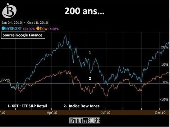 Depuis le début de l'année, le secteur en vogue est celui des biens de consommation comme le montre le graphique ci-dessous. L'ETF des biens de consommation appelé XRT est représenté par la courbe n°1 et le DOW JONES est représenté par la courbe n°2. Pendant que le DOW JONES fait 6,86% depuis le début de l'année 2010, XRT grimpe de près de 24%.