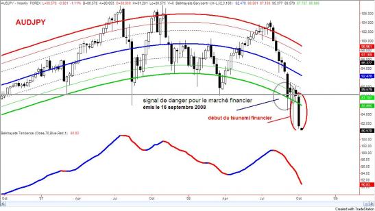 Dans le papier Le CAC, l'Or et le Yen du 16 septembre dernier je recommandais à ceux qui vivent en France de se lever tôt pour surveiller de prés l'évolution de la paire de devise Dollar Australien contre Yen. Ce jour là, le yen avait cassé avec force un support technique très important, déclenchant ainsi une alerte rouge. J'avais expliqué pourquoi cette paire particulière était un excellent indicateur pour les marchés financiers dans leur ensemble. Cette semaine, ce marché a enfoncé avec conviction ce support pour aller atteindre puis casser le premier objectif des 82 yens que nous avions indiqué. Le tsunami a bel et bien démarré. Arrêtons de rêver et d'écouter les politiques, les économistes, les financiers. Il s'agit de sauver ce qui reste à sauver. Aucune chance que la vague avorte, sous prétexte qu'on va se réunir et décider ceci ou cela. Aucune institution au monde ne pourra contrer ce qui a commencé. Regardons ce graphique: