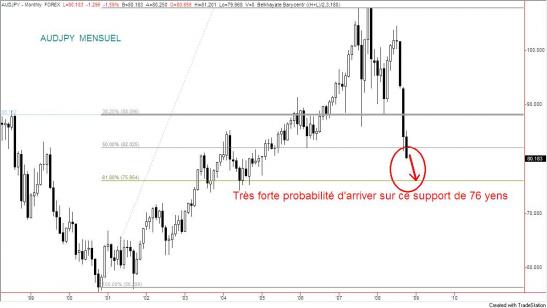 Le marché a enfoncé le support des 50% de Fibonacci. Donc très forte probabilité d'aller chercher, avant 2009, le nombre d'or 76 yens, représentant 61,8% de tout le mouvement haussier depuis 2001. Et ce sera un véritable uppercut dans le ventre de certains gérants internationaux qui ont exagéré dans le yen carry trade