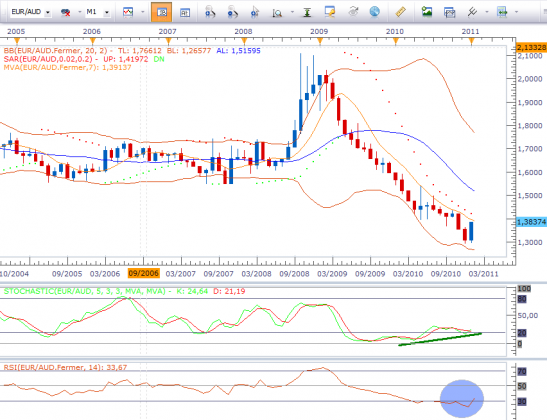 - D'un point de vue technique, l'AUD a atteint des plus bas de 20 ans à 1.293 soit notre zone visée à long terme en tant que dernier objectif baissier. Au niveau des indicateurs, le RSI a atteint un niveau de survente historique (sur les 17 dernières années, je manque d'historique) et sort actuellement de sa zone de survente. De plus, nous constatons une divergence haussière sur la stochastique qui sort elle aussi de sa zone de survente.