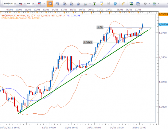 -D'un point de vue fondamental, l'économie australienne florissante tirée par les matières premières jouait en faveur de sa monnaie sans parler du taux d'intérêt directeur de 4.75% qui ravissait les investisseurs. De son côté, l'Euro était en proie aux résurgences des craintes liées aux dettes souveraines, sous pression des spéculateurs. Ainsi, l'AUD surperformait son homologue quoi que fasse le marché.