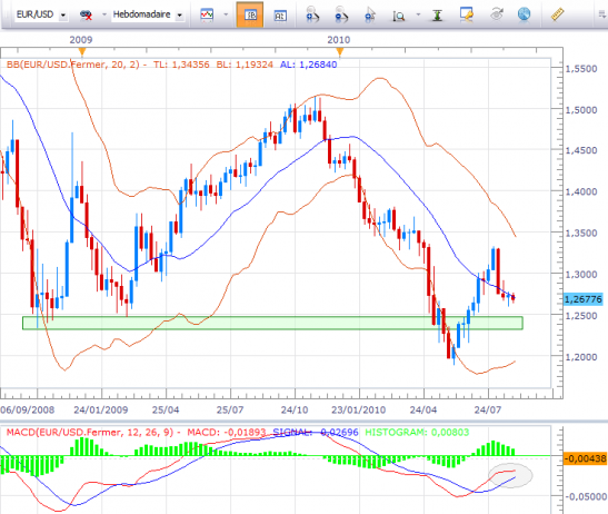 A moyen terme la situation se neutralise peu à peu mais un biais baissier reste à privilégier au vu de la pente baissière de la moyenne mobile à 20 semaines et de l'englobante baissière de début août qui pèse toujours sur les cours. Je ne sais pas si le marché nous gratifiera d'un retour sur les 1.25 USD mais payer au-dessus des plus hauts de la semaine passée à 1.277USD s'avèrerait délicat et reviendrait à s'exposer à une situation à risque. En d'autres termes, je pense qu'opérer sur le court terme par les temps qui courent est une bonne solution.