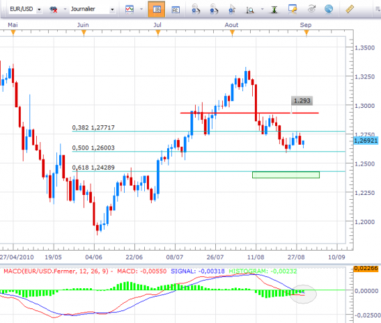 En données journalières, il est rare que l'analyse technique de l'EUR/USD soit aussi propre. Cassure du niveau horizontal des 1.273, ralliement en ligne droite des 50% de retracement de toute la hausse de juin/juillet à 1.26, pullback sur les 1.273 avec un point haut à 1.277 soit les 38.2% de retracement. Bref, en utilisant des stops de protection à 50 pips, de beaux aller/retours pouvaient être effectués.