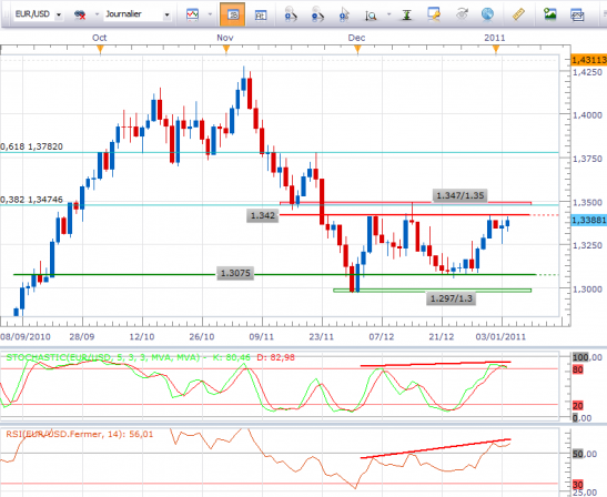 (BFM Bourse) - La paire la plus liquide au monde reprend des couleurs dans le sillage des indices boursiers qui commencent l'année en fanfare. Toutefois, cette hausse en trompe l'œil, soutenue par de faibles volumes, n'occulte en rien le caractère neutre de la situation graphique de court terme du cross EUR/USD et ne doit pas nous faire oublier qu'une épée de Damoclès pèse sur la zone euro. En effet, même si les spreads sur les obligations se sont momentanément resserrés, le risque de résurgence des inquiétudes sur les dettes souveraines persiste et les agences de notations peuvent frapper à tout moment. D'autre part, les opérateurs suivront de près les statistiques d'importance publiées dans les séances à venir comme les chiffres du chômage aux USA de ce vendredi. Tout est possible donc, et que les acheteurs ne crient pas victoire trop rapidement.
