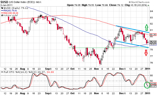 Autre facteur plaidant pour ces scénarios baissiers, l'étude du Dollar Index (voir graphique ci-dessous). Cet indice est neutre entre les bornes 78 et 81 points et évolue dans un canal baissier à faible pente. Ou bien ce dernier prend appui sur sa moyenne mobile à 60 séances qui a déjà fait office de pivot par le passé afin de retrouver les 80 points voire de s'extraire par le haut dudit canal, ou bien un trou d'air aura lieu en direction des 78 points et de la borne basse du canal avant qu'une réaction n'ait lieu. Seul un enfoncement des 78 points mettrait à mal les acheteurs de Dollar et provoquerait une forte appréciation de la paire EUR/USD.