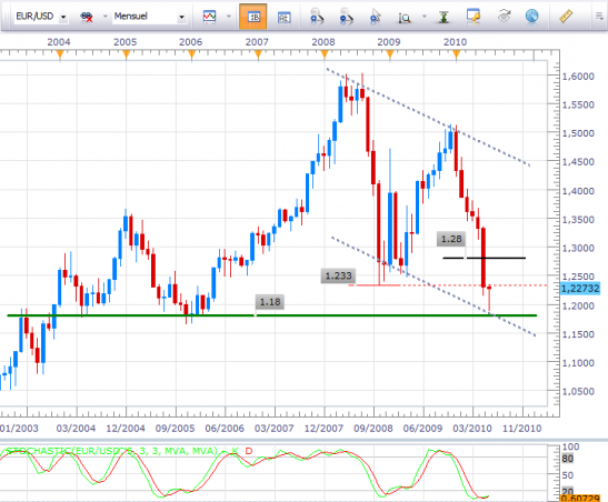 A 1,23 USD, la paire arrive dans en zone de turbulence, les 1,233 USD correspondant aux plus bas de 2008. Aussi, le cross pourrait être fortement chahuté dans les séances à venir. Si les statistiques et l'appétit du risque devaient jouer en sa faveur, l'EUR/USD pourrait rejoindre les 1,25/1.258 USD assez rapidement. N'oublions pas le chemin parcouru à la baisse par la paire en 6 mois seulement…un retracement ne serait-ce que de 25% de ce mouvement nous ramènerait à 1.28 USD et n'aurait rien d'exceptionnel.