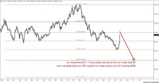 Graphiquement, le dollar est en ce moment même en train de chercher à revenir à tout prix sur le niveau de retracement du nombre d'or 1,618 par rapport à son mouvement d'impulsion haussière entre 1996 et 2001. Ce niveau sera une très forte résistance technique. A partir de cette zone, on devrait assister à un retournement de marché qui remettrait à nouveau le billet vert dans sa tendance de fonds baissière. Et dans ce cas, l'objectif dans les 3 prochaines années serait 60, qui correspond à une baisse de 30%. Pour moi la seule explication valable de la hausse actuelle du dollar réside dans l'illusion que les grands investisseurs ont à l'égard des bons de trésor américains à court terme, les T. Bills. Ils croient dur comme fer que ces derniers sont les produits les plus sûrs de la planète. Et comme les investisseurs étrangers ont besoin d'abord de convertir leur devise locale (euro, yen, franc suisse etc.) en dollar américain, pour acheter ces bons, on assiste à une véritable panique à l'achat. En effet, pour la première fois, depuis une dizaine d'années, je vois défiler sur le Forex des ordres d'achat très lourds… au prix du marché ! On achète à tout va, à tout prix. La motivation est uniquement le gain à très court terme. Ou plus précisément on cherche à ne pas perdre. Cela amène à un gag : la demande de T Bills est si forte que le rendement est passé de 1% il y a un mois à un rendement pratiquement négatif aujourd'hui! Voilà une situation ironique où l'investisseur est disposé à payer de sa poche pour se réfugier dans un produit financier ! Lorsqu'on arrive à cette extrémité, quelque chose ne va pas. La bulle ne peut qu'exploser, comme on l'a vu par le passé. Par conséquent, le dollar monte pour une seule raison : les investisseurs américains et internationaux ont peur et cherchent la sécurité. Que pensez-vous que le dollar va subir lorsque cette peur se dissipera ? La clé de ce film réside dans le concept suivant : les investisseurs ont acheté le dollar non pas parce qu'ils font confiance dans l'économie américaine mais parce qu'ils jugent que, sur le court terme, c'est la meilleure solution pour ne pas perdre de l'argent. Et l'histoire des marchés financiers nous apprend qu'à chaque fois que des décisions ont dû être prises dans l'urgence, basées sur le court terme, le produit sous-jacent finit par s'effondrer. Cette explication fondamentale confirme l'analyse technique ci-dessous. Le dollar américain est voué à perdre au moins 30% sur les 3 prochaines années.