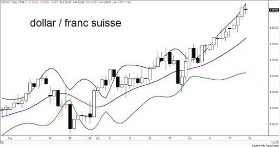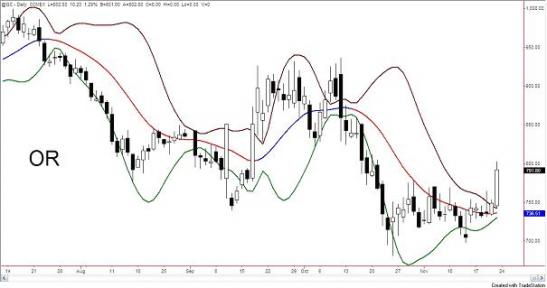 2. les deux bandes qui accompagnent le centre de gravité donnent une idée assez précise de la volatilité du marché à tout moment. Une volatilité directement proportionnelle à leur écartement.
