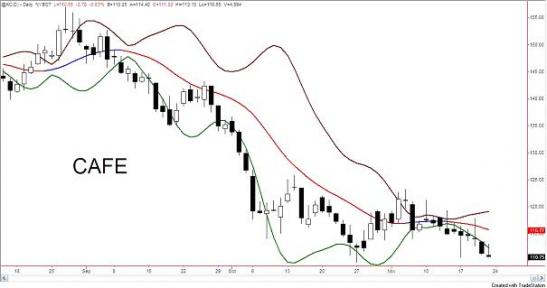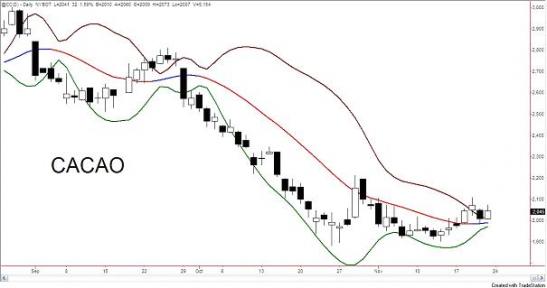 Le café : ce marché est encore dans sa phase baissière et il vaut mieux attendre que les bandes se rapprochent et que le centre de gravité devienne bleu avant d'acheter. Rester à l'écart et ne pas vendre à découvert car nous sommes à un niveau d'un très important support.