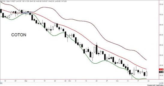Le coton : nous avions recommandé de se pencher sur l'achat du coton dés que le centre de gravité tourne au bleu. Pour le moment les bandes ont commencé à se rapprocher, ce qui est un bon signe, d'autant qu'ici aussi nous sommes à un niveau de support très solide. En quelques jours le centre de gravité peut devenir bleu. Alors ce sera le signal du timing d'achat !