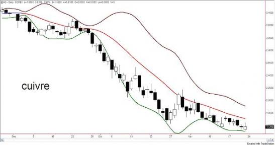 Le cuivre : regardons comme l'indicateur du centre de gravité marché à la perfection sur le marché du cuivre. Il a donné le signal de vente en septembre et depuis il est toujours vendeur puisque toujours rouge. En aucun moment il est devenu bleu malgré quelques tentatives de rebonds. Aujourd'hui, ici aussi les bandes se rapprochent. Je recommande aux vendeurs d'encaisser leurs profits et de plus attendre de baisse et aux acheteurs de se préparer à acheter dés que le centre de gravité deviendra bleu.