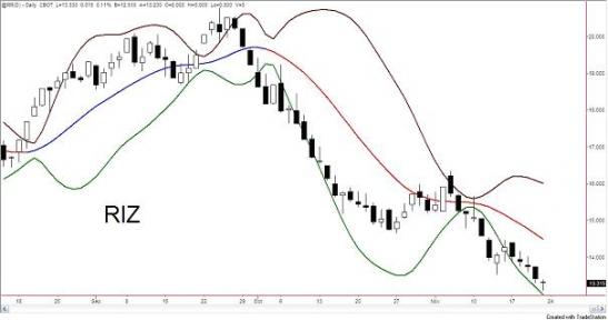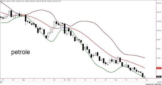 Le pétrole : Voilà ici aussi un marché sur lequel notre centre de gravité a donné d'excellents signaux d'achat et de vente. Celui qui avait suivi ces signaux a réalisé de confortables plus-values sur l'effondrement de ce marché. Pour le moment, le centre de gravité est rouge donc pas question d'acheter bien que les bandes commencent à se rapprocher. Vendredi dernier, le marché a marqué un signe non négligeable de frein de la baisse. Nous allons donc guetter le moment où les bandes vont se rapprocher davantage et dès que le centre de gravité deviendra bleu on passera à l'achat.