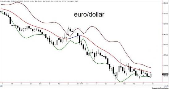 L'Euro contre le Dollar : voilà le marché le plus important au monde. Toutes les entreprises opératrices sur le commerce international sont concernées par son évolution quotidienne. Nous constatons ici aussi que le centre de gravité a été d'une pertinence remarquable. Pour la semaine à venir, il nous faut guetter le moment où les bandes vont se rapprocher et le centre de gravité devenir bleu pour entrer à l'achat.