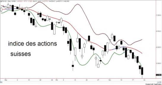 Indice des actions suisses : il est clair que nous avons là un marché baissier. Il ne faut pas acheter tant que le centre de gravité ne devienne bleu. Notre recommandation est de ne pas rester exposé… Car la baisse peut s'accélérer.