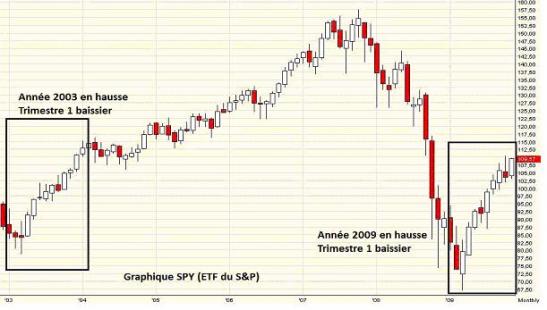 (BFM Bourse) - Les récents événements sur les indices favorisent largement les adeptes de la hausse, les cours sont au-dessus des moyennes mobiles 50 jours pour le S&P500 et le Nasdaq 100. Le seul souci vient des Small Cap, où les annonces de résultats semblent être – dans l'ensemble – attendues à sous-performer le marché. Donc, le plus difficile reste à faire : finir l'année dans le vert ! Si on regarde ce qui s'est passé en 2003 (graphique ci-dessous), une situation similaire à aujourd'hui techniquement, nous pouvons nous attendre à finir en hausse sur l'année.