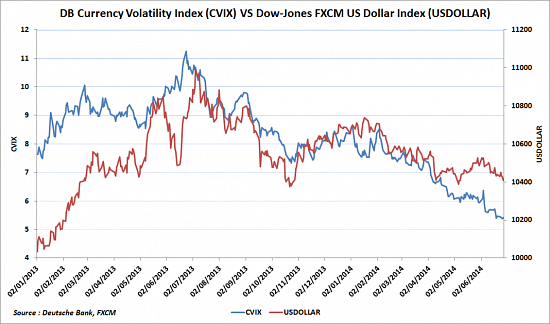 Les indices de volatilité sur les marchés actions continuent de reculer, et tel est également le cas pour le marché des changes. Le Deutsche Bank Currency Volatility Index (CVIX), qui mesure la volatilité implicite des options de change sur 9 paires de devises majeures, enregistre de nouveaux plus bas en juin alors que le sentiment du risque reste stable. Comme le graphique ci-dessous vous le montre, le dollar américain a tendance à perdre du terrain dans un environnement où les opérateurs anticipent peu de volatilité sur le marché.