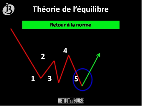 Notre fameuse technique des traders de Chicago est basée sur la relation inverse. Par exemple, supposons qu'il existe une tendance affirmée sur une paire de devises et que la ligne de tendance vient à être briser. Inversement à la décroissance libre, une croissance libre commence à se dessiner avec un premier bas de marché appelé 1 suite à une tendance baissière, puis le marché remonte pour former un haut de marché appelé 2, ensuite redescend en dessous du point 1 en un point appelé 3, puis remonte au-dessus du point 2 pour former un haut appelé 4, et enfin chute sous les points 1 et 3 pour former le point 5. Oui, c'est un travail d'habitude pour déceler ces configurations, personne n'a dit qu'il est facile de gagner sa vie en Bourse, sauf ceux qui ne tradent pas… Due à la croissance libre créée par cette exagération de marché (ceci est en fait une bataille féroce entre les Bulls et les Bears), notre signal d'achat apparait de lui-même au point 5. Le schéma ci-dessous montre la théorie.