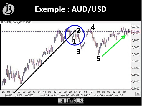 Prenons maintenant un exemple : la configuration très particulière sur l'AUD/USD. En effet, comme vous pouvez le constater sur le graphique ci-dessous (graphique daily de AUD/USD), se sont bien dessinés les 5 points essentiels à cette technique spécifique, puis s'est bien libérée par la suite une force poussant les cours à la hausse depuis notre signal d'achat situé au point 5. Il vous suffit d'habituer votre œil à regarder et rechercher ce type de configuration pour apprendre à les déceler. Deux vidéos gratuites ont été mises en ligne sur le site de l'Institut de la Bourse afin de vous permettre de voir et revoir cette configuration dans les détails. Cliquez ici pour accéder à la première vidéo, cliquez ici pour accéder à la deuxième vidéo.