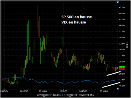 (BFM Bourse) - Faisons un premier bilan de la situation : Le VIX (indice de volatilité du CBOE) nous montre très clairement une zone support entre 21 et 22, comme vous pouvez le constater sur le graphique ci-dessous. Un fait intéressant vient de se reproduire, souvenez-vous en mars, nous avions assisté à une réaction « normale » du VIX. Tout le monde connait la corrélation inversée du S&P 500 par rapport au VIX : habituellement à chaque fois que le S&P 500 tombe, le VIX monte et inversement. Cette fois-ci le S&P a été en hausse tout le mois de septembre alors que le VIX est resté quasiment inchangé. Sur le graphique, vous constaterez aussi le phénomène dont je vous parle : l'indice large de la Bourse américaine - le S&P 500 – monte (courbe bleue) et le VIX monte également, ceci est - pour nous Traders - une divergence claire entre la volatilité attendue et le cours des actions.