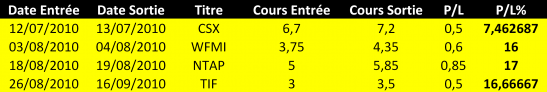 Une nouvelle saison de résultats arrive : C'est bientôt le démarrage de la saison des résultats après le trimestre Q3 ! Je vous l'ai déjà expliqué plusieurs fois, chaque trimestre, les sociétés cotées annoncent leurs résultats trimestriels et les rapports sont rendus accessibles au public. Chaque fin de trimestre calendaire, soit après les 31 mars, 30 juin, 30 septembre et 31 décembre, les annonces de résultats commencent à arriver sur nos flux de cotations. Ceci devrait donc favoriser le retour de la volatilité en octobre. C'est pour cette raison que je vous propose de revoir les résultats de notre fameuse stratégie Warrior Earnings (je vous en ai parlé dans l'article du 15 juillet 2010), j'ai créée cette technique lorsque j'étais au Chicago Board Options Exchange (Bourse de Chicago). Pour mémoire, j'achète des calls et je vends des calls puis j'achète des puts et je vends des puts au même moment et dans une même transaction. Cette stratégie permet de gagner que le marché descende, stagne, ou monte. Et seulement 4 positions ont été initiées durant ce dernier trimestre et le résultat est impressionnant compte tenu du risque maitrisé sur chaque position imposée par la stratégie :