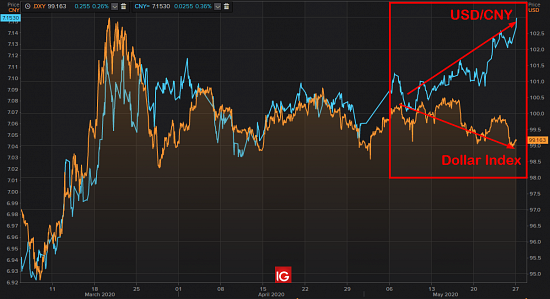 La divergence est frappante depuis le début du mois: la devise chinoise (CNY) perd du terrain face au billet vert alors que dans le même temps le Dollar Index (indice mesurant la cote du dollar par rapport à une panier de devises majeures, dont l’euro) ne progresse pas. La dichotomie s’est accentuée au cours des derniers jours avec l’accroissement des tensions entre les Etats-Unis et la Chine.