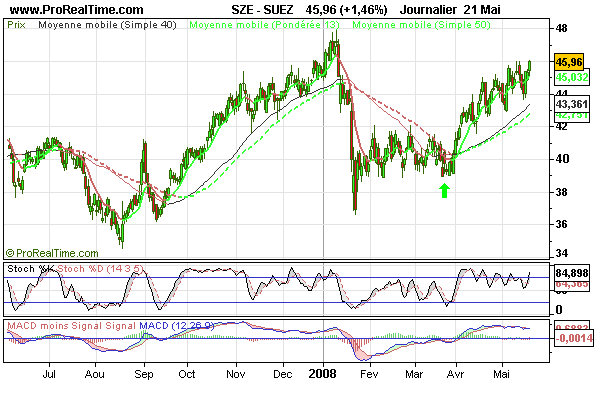 Supposez que vous soyez au début du mois de janvier, les moyennes de vos graphiques sont à la hausse. Vous êtes tentés de prendre le Suez à la hausse. Cependant, un coup d'oeil sur le graphique journalier vous indique que la moyenne 50 est à la baisse. Vous pouvez donc penser que la période de baisse n'est pas finie et qu'il vaut mieux attendre. Pour prendre la décision d'achat, vous avez donc regardé votre graphique quotidien et attendu que la moyenne commence à se retourner. Vous allez conforter votre décision en utilisant les deux indicateurs stochastiques et MACD qui vous indiqueront le moment favorable. Le triptyque vous aidera aussi à choisir votre objectif (ici par exemple 48) et votre stop (si par exemple 36,5 ou plus serré 38.8). Ainsi grâce au triptyque vous avez séparé les deux fonctions: la décision et l'action. La décision se fait sur les graphiques hebdomadaire et mensuel. L'action, sur le graphique journalier.