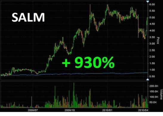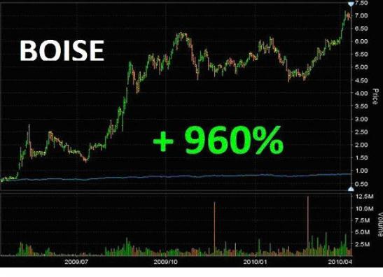Comme je l'ai déjà expliqué, le challenge de l'investisseur est donc d'acheter des entreprises dont la valeur est supérieure à leur prix de valorisation par le marché et non pas l'inverse. Suivant donc les principes du meilleur investisseur au monde, je me suis intéressé aux valeurs qui avaient les critères de sélection définis. J'ai choisi de vous montrer 2 exemples : BOISE (BZ) et SALEM COMMUNICATIONS (SALM). Après avoir été détectées par les adeptes des stratégies d'investissement de Warren Buffett, ces deux sociétés ont affiché des performances respectives de 960% et 930% en moins d'un an.