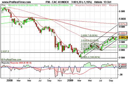 Conclusion pour le moment, la tendance haussière est encore active. Est-ce que cela veut dire qu'il faut se précipiter pour acheter ? Pas forcement, car un retour du Cac 40 alentour de 3700 n'a rien d'impossible. Quitter ses positions ? Pas encore, alors que la tendance est encore positive. Bien entendu je ne parle pas ici de trading intra-day, mais de positions pour les investisseurs moyen terme (quelques semaines à quelques mois). Nous devons cependant constater que la résistance autour de 3850 de ces derniers jours, semble jouer son rôle et que l'on ne pourra atteindre les 4000 souhaités par bien des gens, que si cette résistance est enfoncée. Les quatre mille devenant ensuite résistance. Non pas simplement par la magie des mots, mais parce que la moyenne trimestrielle de 13 trimestres est toujours en baisse et passe à peu prés vers les 4000.