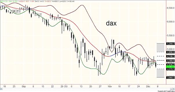 Malgré la dernière baisse de vendredi, le marché allemand reste très solide et la probabilité que lundi matin nous assistions à un gap haussier est de 90%. J'achèterai quand même dés l'ouverture une première partie de ma position, et serai prêt à renforcer dés la seconde heure. Ici aussi le rétrécissement des bandes d'or annonce clairement un retournement de tendance. Le moral sera de retour la semaine prochaine en Europe.