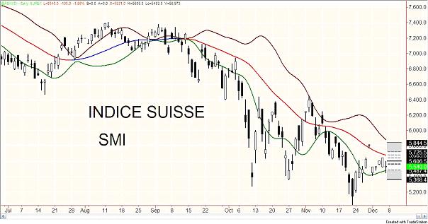 L'indice suisse a besoin de plus d'effort pour changer la couleur rouge du centre de gravité en bleu. Il y arrivera certainement mercredi ou jeudi prochain. Pour le moment, on constate qu'il doit casser 5700 pour entrer dans la zone « soleil ». Ce marché est dans une phase de congestion depuis le 13 octobre et l'on ne pourra affirmer qu'il la quitte que lorsqu'il aura franchi la barre des 6400.