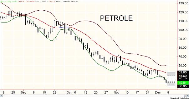 Voilà un marché qui a étonné plus d'un trader. La baisse depuis l'été est incroyable, passant de 140 à 40 USD le baril. Si je ne suivais pas mes indicateurs j'aurai encaissé mes gains plusieurs fois. Sur les marchés boursiers la raison n'a pas de place. Il faut avoir la rigueur de croire en la probabilité (ici en l'occurrence le centre de gravité). J'avais recommandé un rachat du pétrole la semaine dernière, alors que le centre de gravité était encore rouge. Je me suis en fait convaincu qu'on était vraiment allé trop bas. Moral de l'histoire : on ne va jamais trop bas en bourse. Heureusement le stop était serré. Quelque chose me dit que dés ce lundi on devrait assister à la remontée du pétrole mais je vous recommande de ne rien faire tant que les bandes ne se rapprochent pas et surtout tant que le centre de gravité ne devienne bleu. Vous allez peut être acheter un peu plus cher que les autres mais lorsque vous y serez, vous aurez une bien meilleure espérance mathématique de gain.