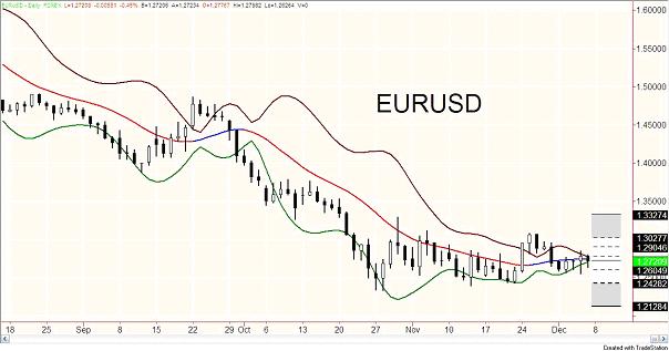 Voilà la configuration type d'une imminente volatilité d'un marché : les bandes se sont rapprochées au maximum. Et regardez la couleur du centre de gravité : BLEU !! Achetez à fond l'euro dés lundi car il peut accélérer de manière surprenante. Et là encore votre stop doit être serré car ce marché est techniquement voué à prendre une tendance et non pas à tergiverser puisque les bandes d'or se touchent presque. Par contre, attention : si la couleur devient rouge c'est la baisse qui revient au galop…