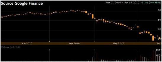 Probablement non si vous regardez de près le graphique boursier de la valeur ci-dessus. En effet, il est difficile de trouver actuellement un analyste positif sur le titre :tous s'accordent pour dire que le géant britannique du pétrole ne pourra pas régler la facture dans le Golfe du Mexique. Le président de BP, Carl-Henric Svanberg, considéré comme trop discret depuis le déclenchement de la marée noire, doit maintenant s'expliquer avec le président Barack Obama. Même s'il est sous le feu des médias en ce moment et vu par le monde entier comme le vilain petit canard, il a tout de même promis que BP ferait le nécessaire pour nettoyer le rivage et tirer les conséquences de cette catastrophe. Allez expliquer ceci aux habitants de la Louisiane…