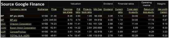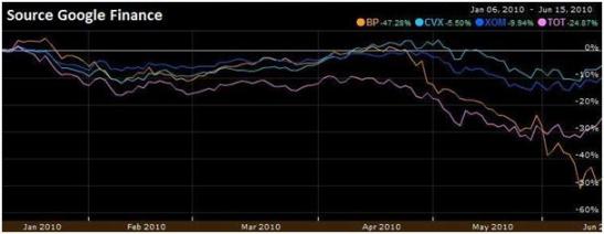Il suffit juste de regarder le graphique ci-dessous pour s'apercevoir que BP perd près de - 50% depuis le début de l'année 2010, alors que ses concurrents Chevron, Exxon et Total perdent respectivement - 5,50%, - 9,94% et – 24,87%. Warren Buffett ne donnant jamais de conseils ni astuces sur sa manière d'investir, il ne faut pas oublier qu'il est le premier à investir dans les mastodontes sous-cotés… « Notre but est de découvrir des compagnies extraordinaires à des prix ordinaires et non des compagnies ordinaires à des prix extraordinaires » dixit Warren Buffett.