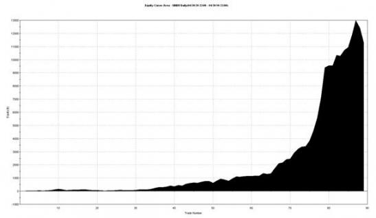 Pour illustrer ce propos, voici la courbe de profit d'un système qui entrerait à l'achat sur l'indice Dow Jones le premier novembre et clôturerait sa position le premier mai de l'année suivante et ce depuis les quatre vingt dix dernières années.