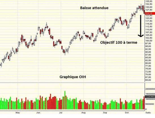 Enfin, côté volatilité – faible en ce moment : le chiffre rond de 20 devrait faire son effet de rebond, ce qui est plutôt un signe baissier sur les marchés boursiers. Les volumes sur options dans le secteur énergétique ont été importants, ce qui nous laisse penser que les ventes vont pousser le marché vers le bas. Nous initions en conséquence une position short sur OIH pour le moment.