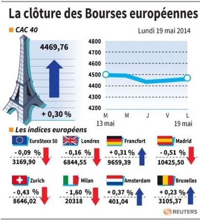 À Paris, le CAC 40 a gagné 0,30% (13,48 points) à 4.469,76 points. Même tendance à Francfort où le Dax a progressé de 0,31% tandis qu'à Londres le FTSE cédait 0,16%.