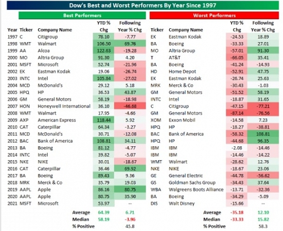 Sur cette période, la valeur du DJIA ayant réalisé la meilleure performance annuelle n'a engrangé qu'un gain moyen supplémentaire de 6,71% l'année suivante, avec des rendements positifs dans seulement 45,8 % des cas. "Sur une base médiane, la performance de l'année suivante pour le plus grand gagnant du Dow Jones est même négative (-3,96%)" remarquent-ils.