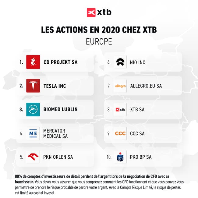 En plus du marché français, la plateforme XTB a également permis à un grand nombre de ses utilisateurs de profiter d’actions proposées sur les marchés allemand, espagnol, portugais, roumain, tchèque, slovaque et polonais. C’est d’ailleurs ce dernier marché qui a tiré son épingle du jeu en 2020 puisque huit entreprises sur les dix présentes au sein du classement européen sont polonaises. Parmi elles, on trouve notamment le studio de développement de jeux vidéo CD Projekt, qui a sorti son titre très attendu Cyberpunk 2077 en décembre dernier, ou encore le groupe pharmaceutique Biomed Lublin. « Les investisseurs polonais représentent la grande majorité des investisseurs sur Actions parmi les clients XTB. C’est pourquoi, sans grande surprise, la liste des Actions les plus populaires comprend de nombreuses entreprises polonaises », explique Réda Aboutika, Chef Analyste chez XTB. « Néanmoins, en raison de leur popularité mondiale, les actions de CD Projekt bénéficient également d’un fort attrait dans d’autres pays. » Le reste du classement compte à nouveau Tesla, ainsi que la société chinoise Nio, elle aussi spécialisée dans le secteur de la voiture électrique.