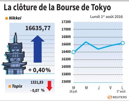 TOKYO (Reuters) - La Bourse de Tokyo a fini en hausse de 0,40% lundi, dans un marché rassuré par la stabilisation du yen après son envolée de vendredi.L'indice Nikkei, longtemps hésitant, a gagné 66,50 points à 16.635,77 mais le Topix, plus large, a cédé 0,91 point (0,07%) à 1.321,83.