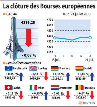 À Paris, le CAC 40 a terminé en repli de 3,51 points, soit 0,08%, à 4.376,25. Le Footsie britannique a cédé 0,43% et le SMI suisse 0,18% mais le Dax allemand a avancé de 0,14% et le FTMib italien de 0,25%.