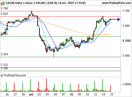 L'indice phare français a tracé hier une bougie au corps quasi inexistant contenu dans le corps de la bougie remarquable précédente, accréditant l'essoufflement du camp acheteur à proximité d'une zone de résistance. L'indice tricolore va continuer se confronter à une zone de résistance puissante sous les 5 700 points. Seul un franchissement de ce seuil sans hésitation viendrait annihiler tout scénario baissier sur l'indice.